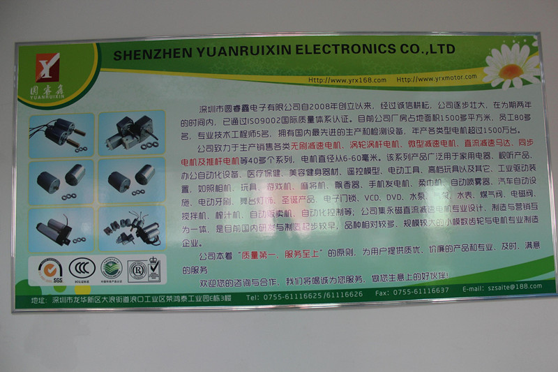 深圳市圓睿鑫電子有限公司自2008年創(chuàng)立以來,經過誠信耕耘,在為期兩年的時間內,已通過ISO9001:2000國際質量體系認證。公司廠房占地面積2000多平方米,員工100人,專業(yè)技術工程師6名,擁有國內最先進的生產和檢測設備,年產各類減速電機超過2~300萬臺。因公司發(fā)展需要,于2020年底,將生產基地遷往擁有最美小鎮之稱的東莞市清溪鎮,依山傍水,依托美麗的大自然環(huán)境和地方文化,全新的東莞市圓睿鑫電子有限公司將借助深圳母公司平臺,一步步走上新的臺階。 東莞公司將繼續(xù)致力于生產銷售各類無刷減速電機 渦輪渦桿電機,微型減速電機,直流減速馬達,交流手搖發(fā)電機、同步電機及空心杯電機等,電機直徑從6-60毫米為定位,系列產品廣泛用于智能家電、智能辦公自動化設備、智能醫(yī)療、美容健身器材、遙控模型、電動工具、高檔玩具以及其它工業(yè)驅動裝置,如高檔玩具、游戲機、麻將機、飄香器、手機發(fā)電機、柔巾機、自動噴霧器、汽車自動設施、電動牙刷、舞臺燈飾、圣誕產品、智能電子門鎖、VCD、DVD、水泵、氣泵、水表、煤氣閥、電磁閥、攪拌機、榨汁...